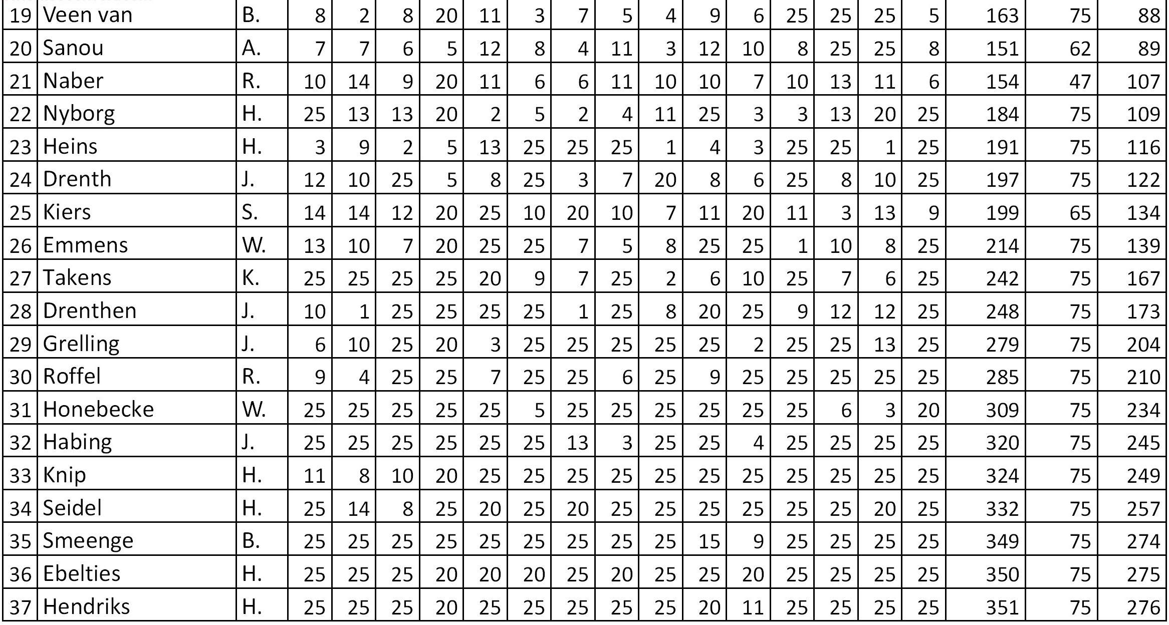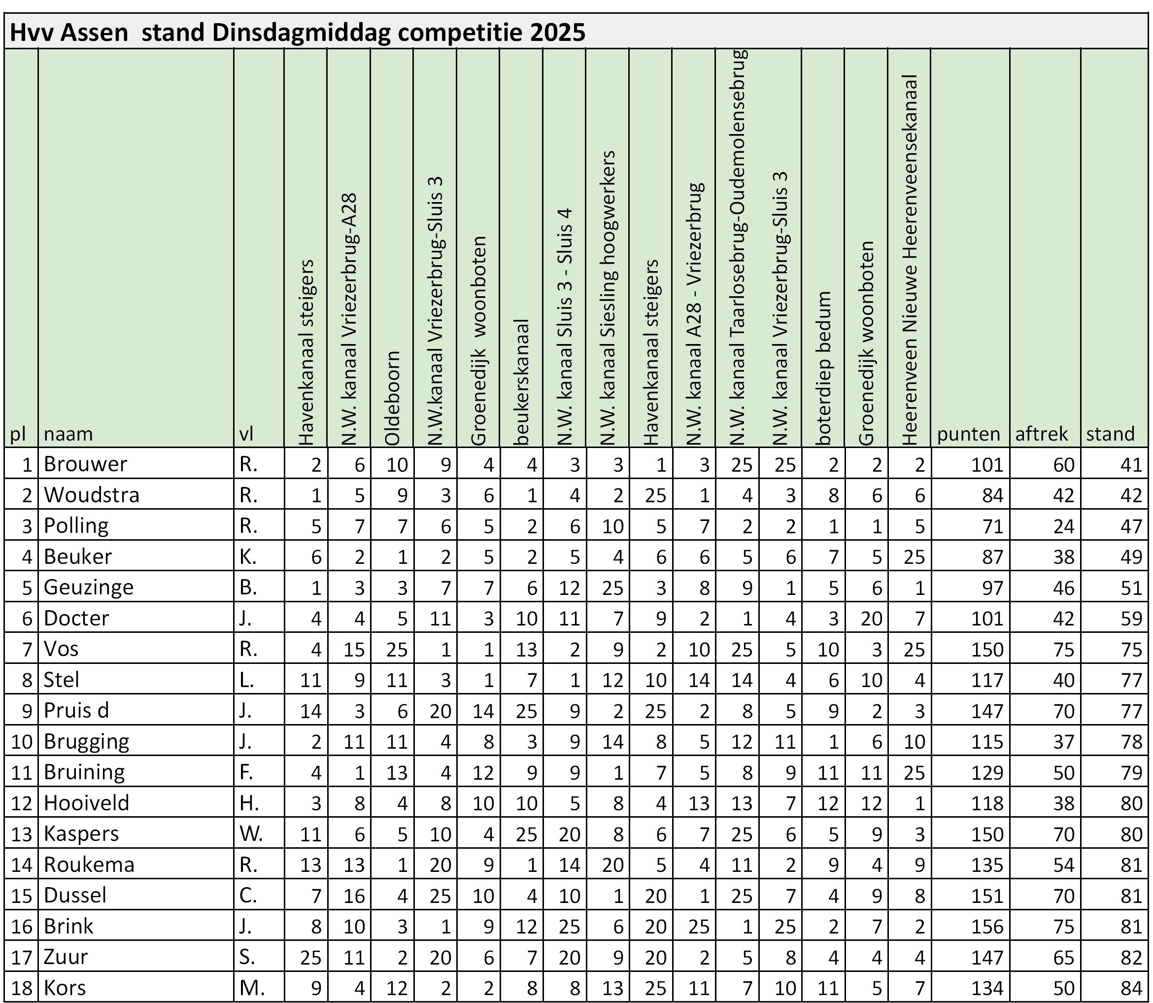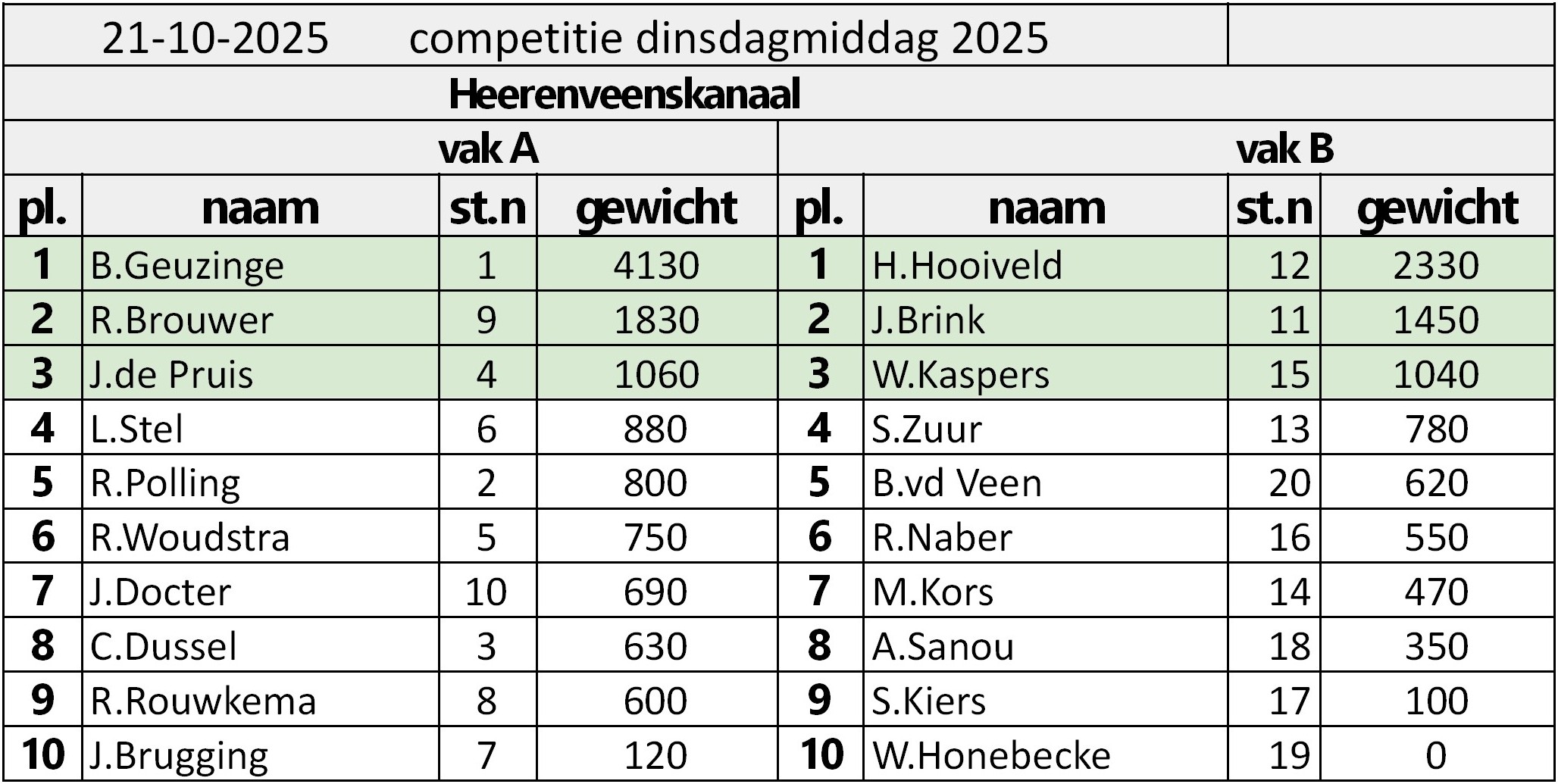 Hierbij de wedstrijduitslag van dinsdag 21 oktober jl. en tevens de einduitslag van de dinsdag-competitie van dit seizoen, na 15 geviste wedstrijden.